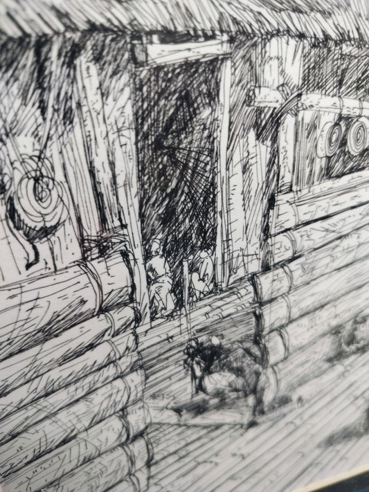 Meges Pen & Ink "Bidayuh Longhouse", 56cm x 45cm