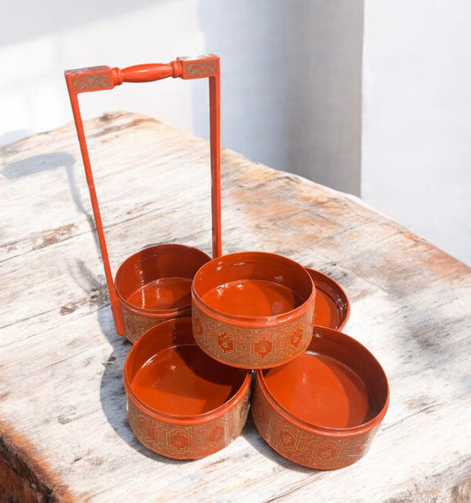Antique 19th Burmese four-tiered lacquered cylindrical tiffin box or food carrier/picnic basket,
