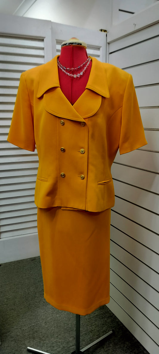 Anetha Crawford, Yellow double breasteol jacket, below knee skirt. Size-16.