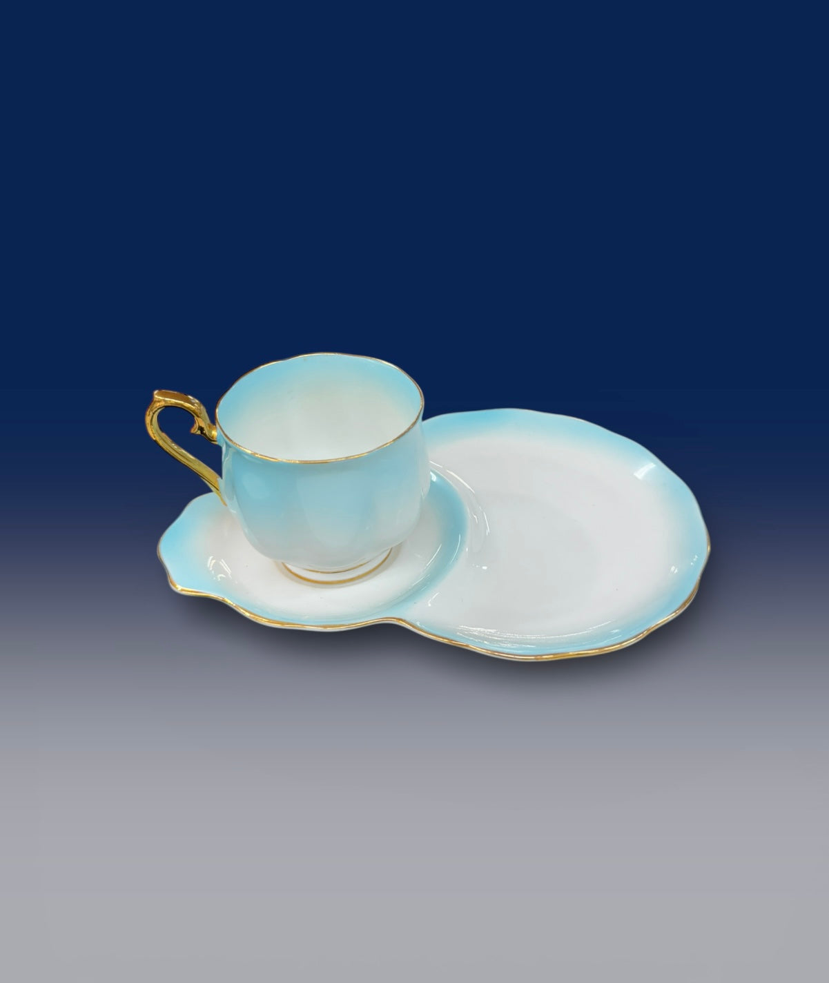 Beautiful vintage Royal Albert teacup and snack plate dating to the 1950s. This charming set features the elegant Hampton shape and a soft rainbow blue glaze, accented with classic Royal Albert detailing. A timeless example of mid-century English bone china craftsmanship.