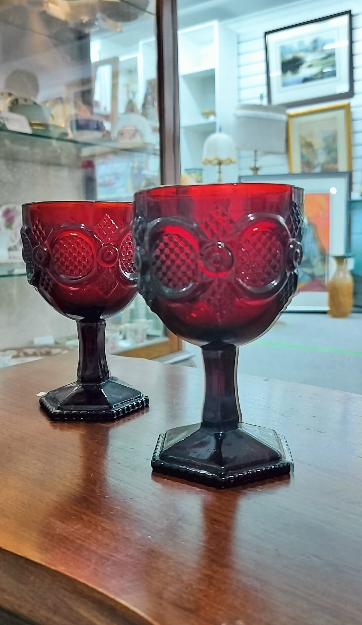 This pair of retro ruby red glasses adds a touch of vintage charm to any table setting. With its sleek design and vibrant color, it's perfect for serving up your favorite beverages with style.