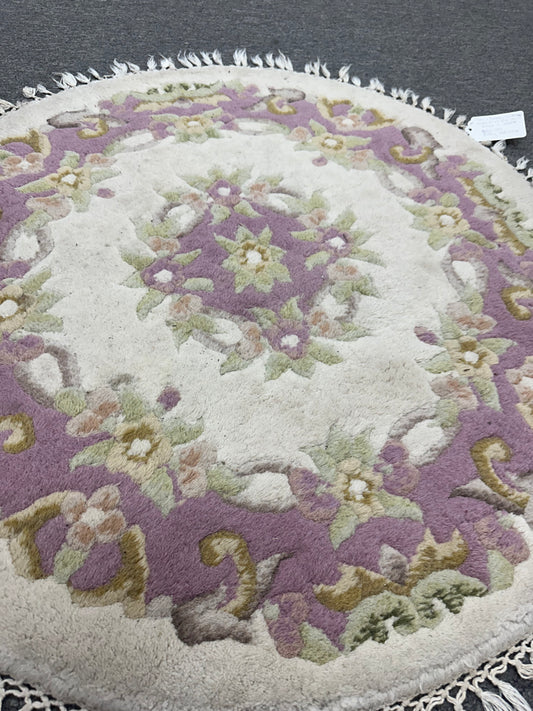 Cream Mauve + Olive Wool Circel Rug , Handknotted + Fringed, Bed room Rug, Round