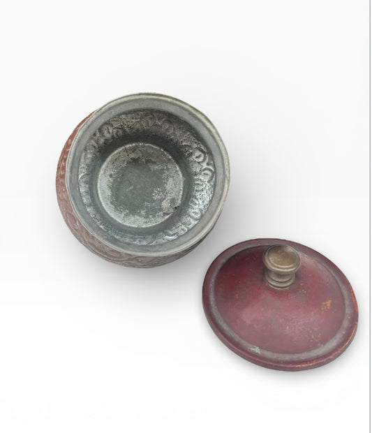 Vintage Copper made jar with lid, embossed pattern,