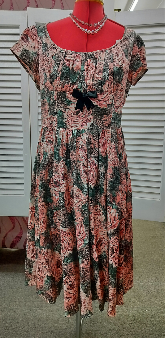 Green cotton, Floral 1950's style. Lazy Bones dress. Size-XL.