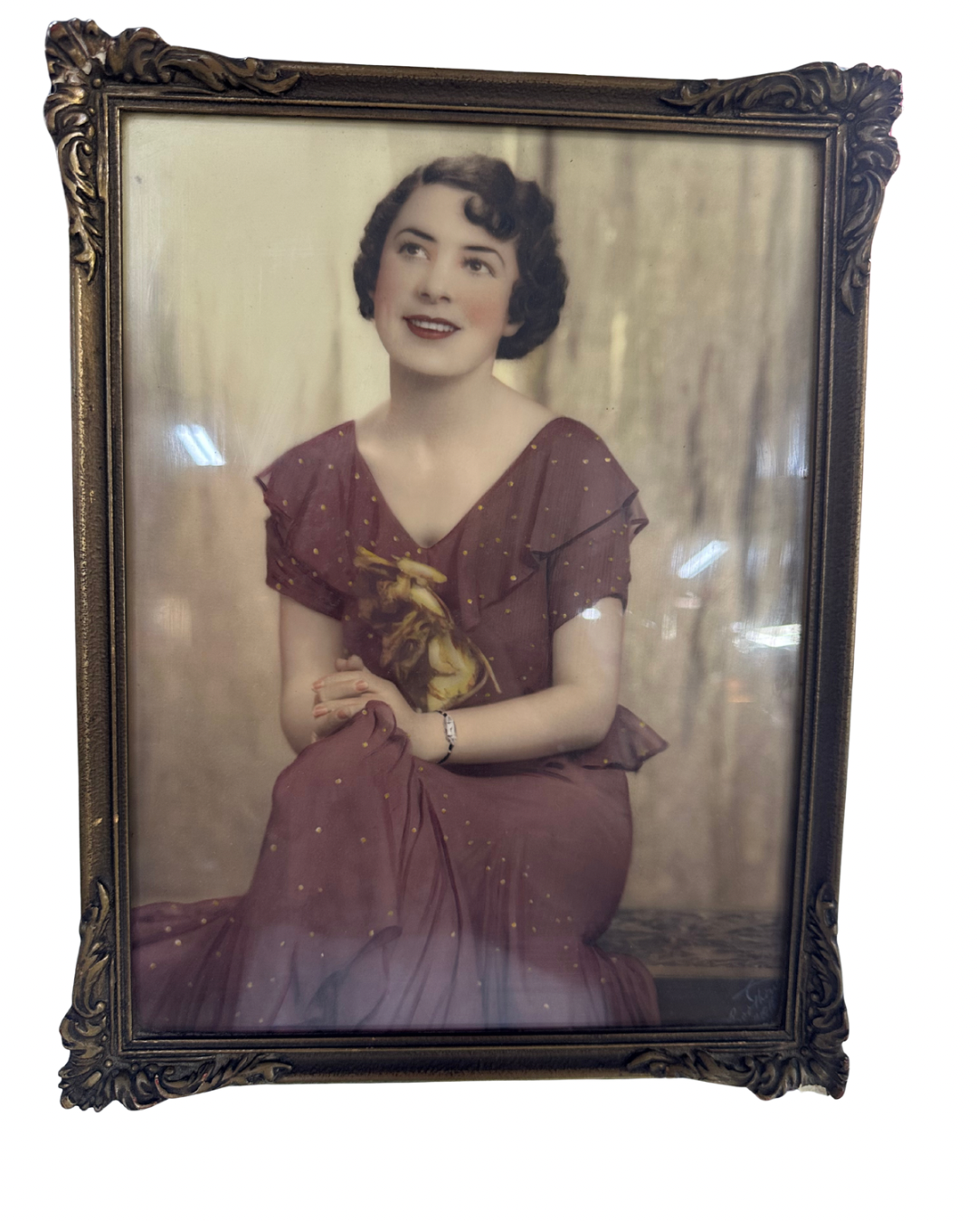 A beautiful hand-tinted studio portrait from the 1930s, set in an ornate vintage frame. Soft colouring and gentle expression give this piece a calm, nostalgic presence. Light age wear consistent with vintage display adds to its charm. A lovely statement for a hallway, bedroom, or layered gallery wall.
