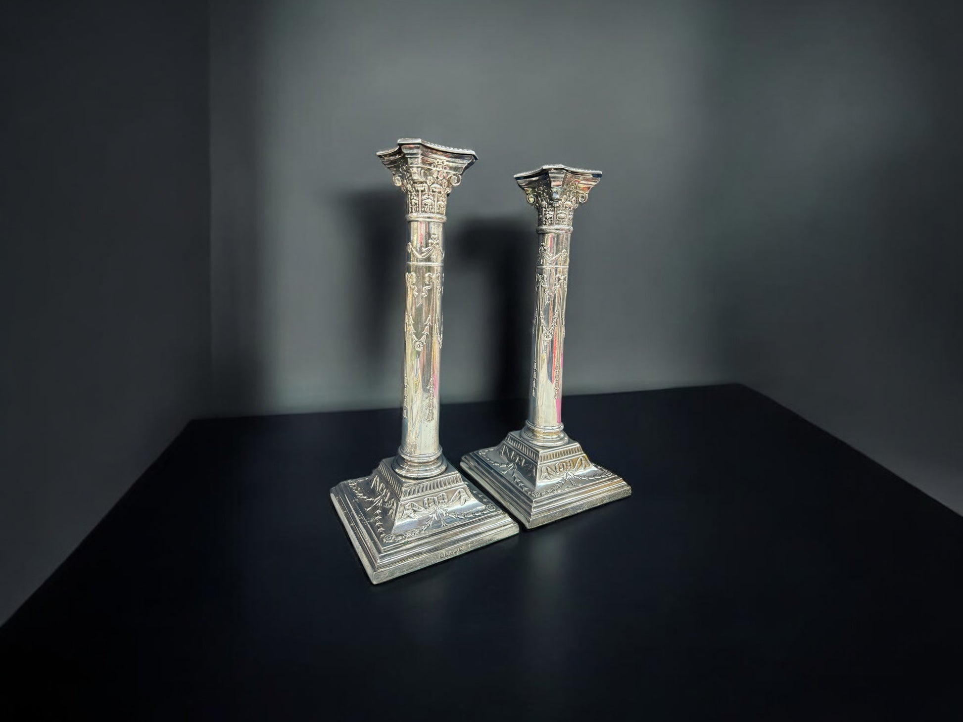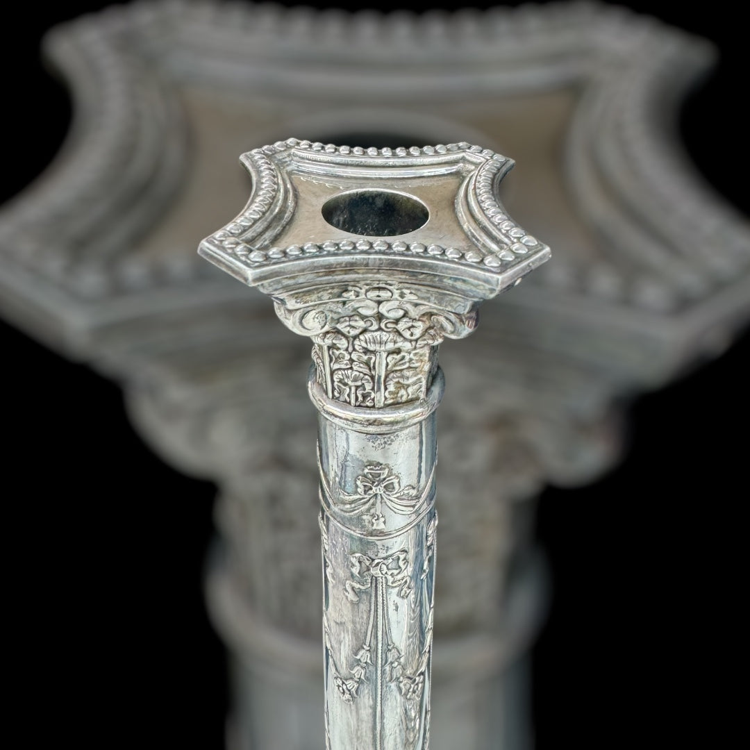 This stunning pair of antique silver-plated candlesticks is crafted in the classic Corinthian column style, known for its decorative acanthus leaf capitals and architectural presence.