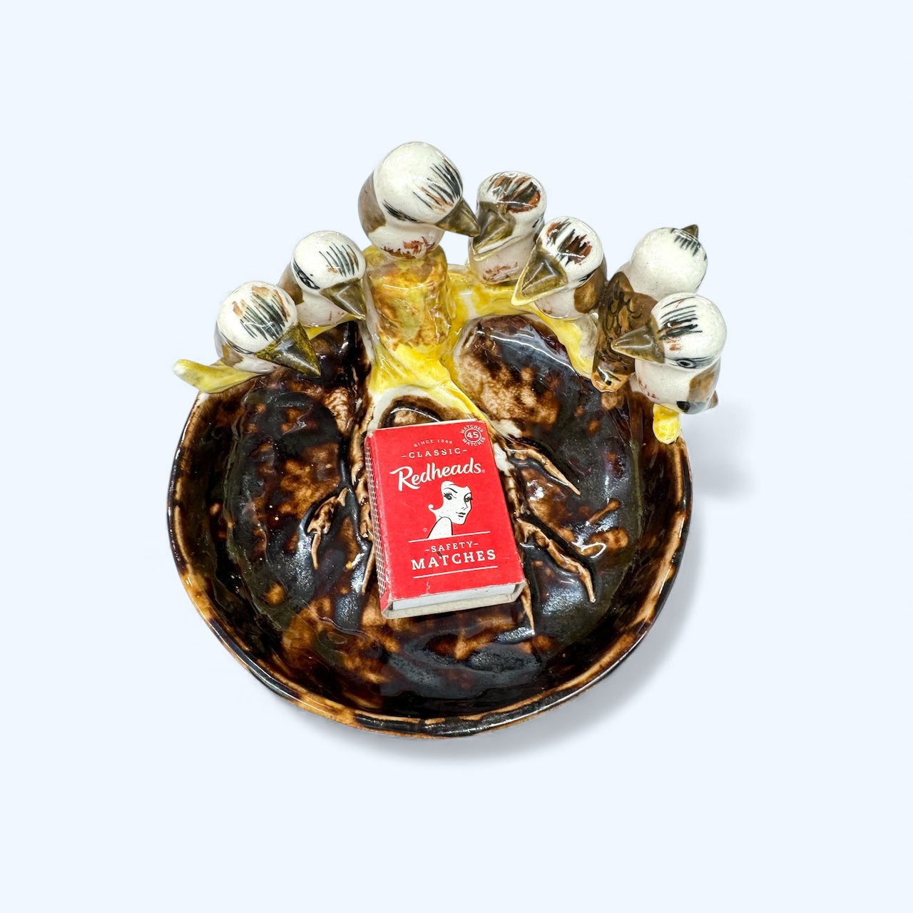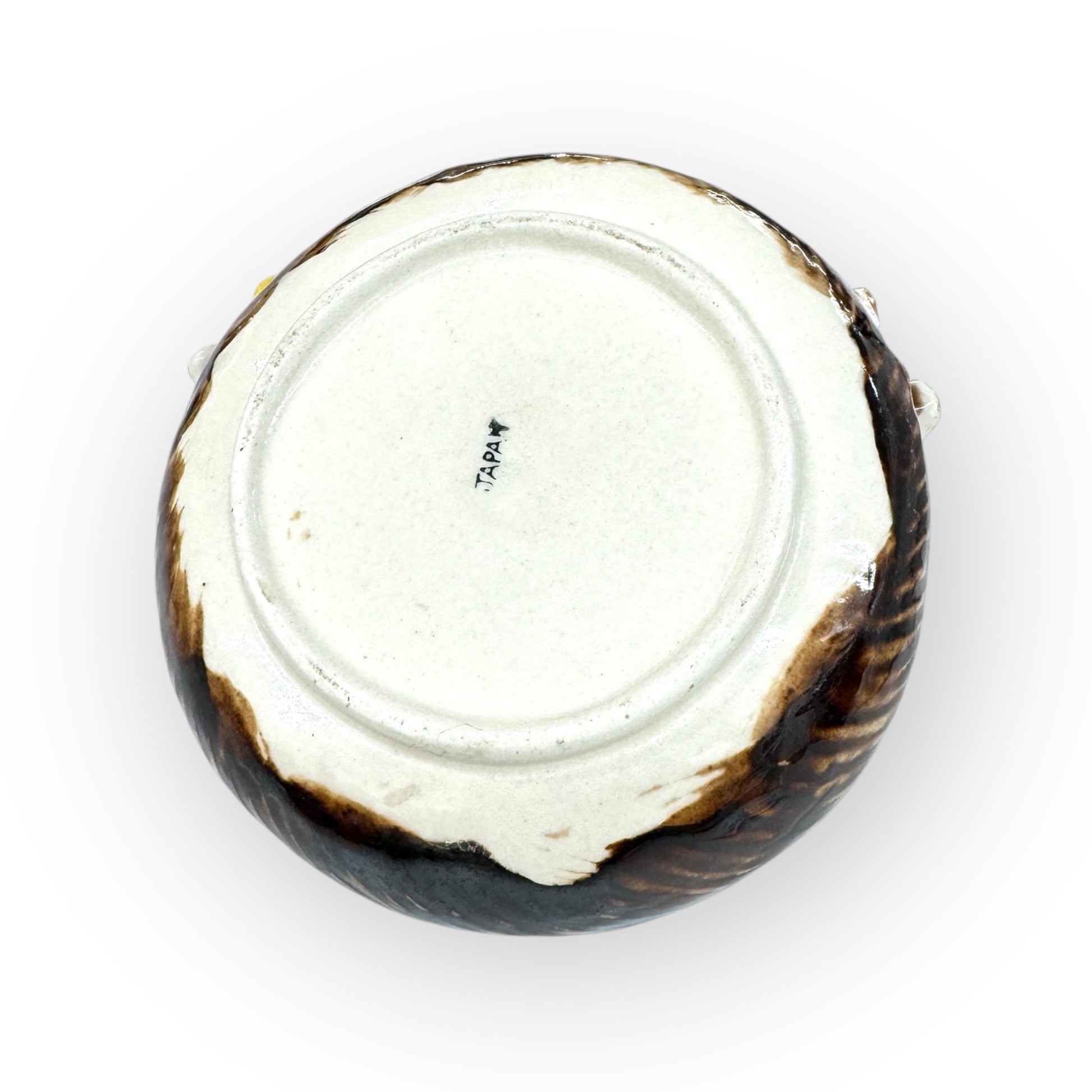 A charming vintage Japanese-made ceramic bowl featuring six kookaburras perched around a central tree stump. Beautifully hand-painted with warm earthy tones and expressive detail, this piece blends Australian wildlife with classic mid-century Japanese pottery craftsmanship.