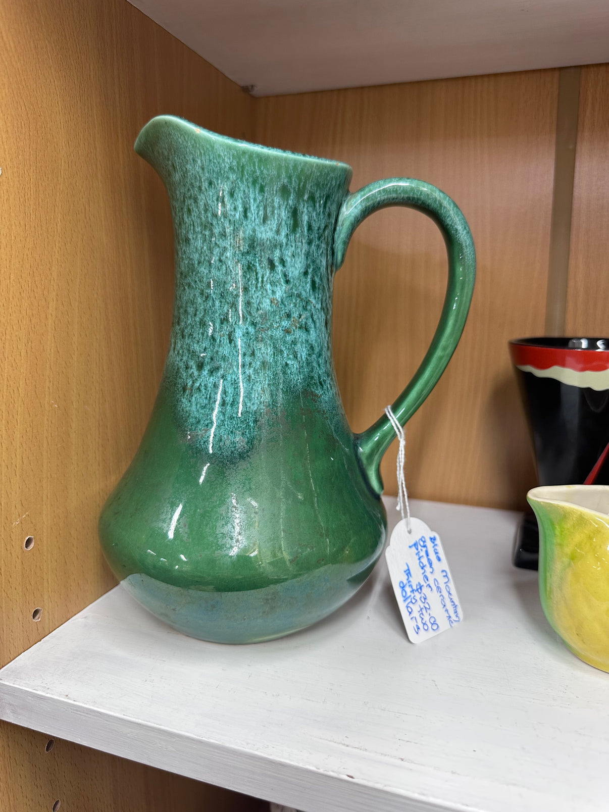 This middle century’s Blue Mountain Green Ceramic Pitcher is a beautiful addition to any home. With its unique blue and green pattern, this pitcher is not only visually appealing but also functional.