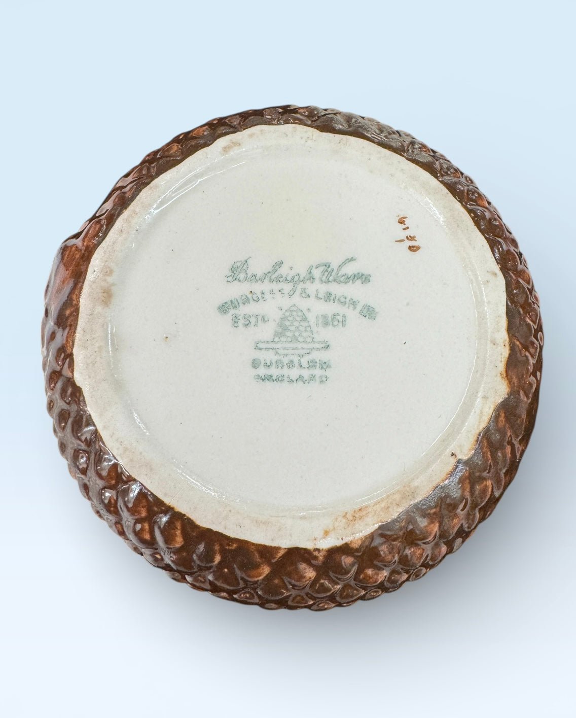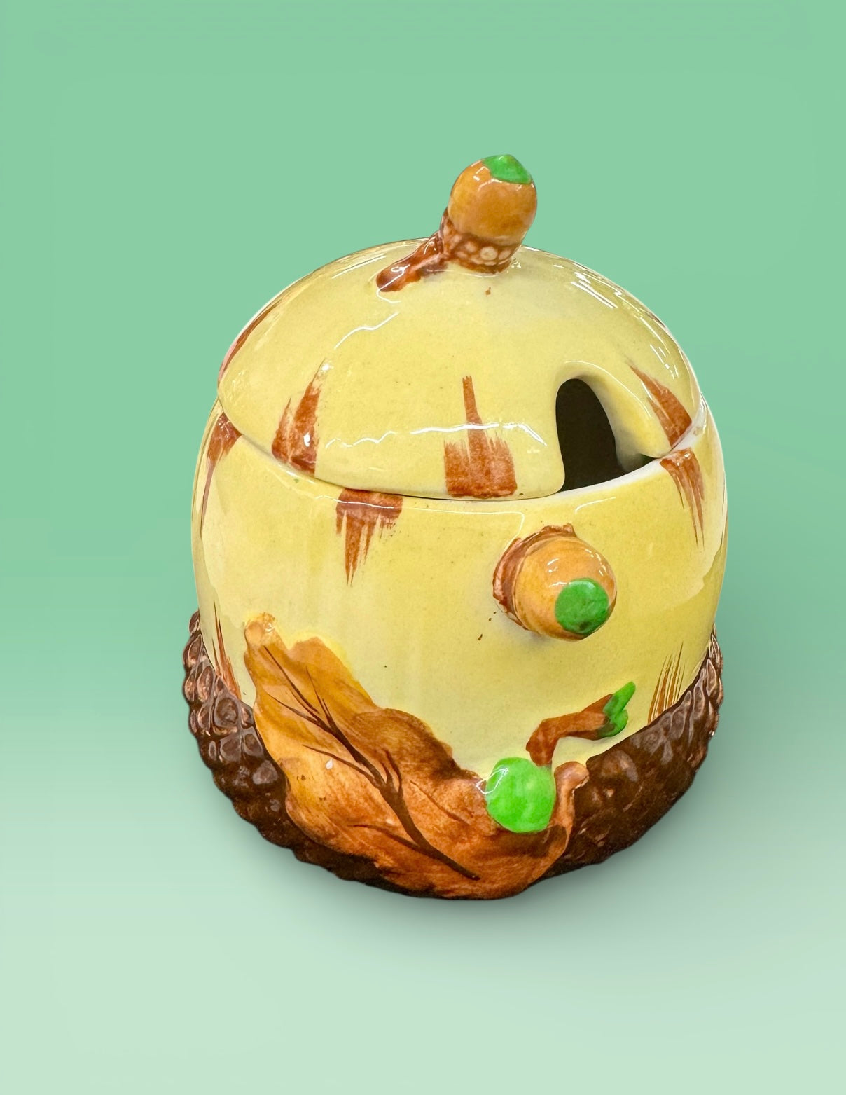 Charming vintage Burleigh Ware acorn-shaped sugar bowl, made in England. Featuring a textured oak-tree base and hand-applied acorn details, this whimsical piece dates to the early–mid 20th century and reflects classic English novelty ware design.