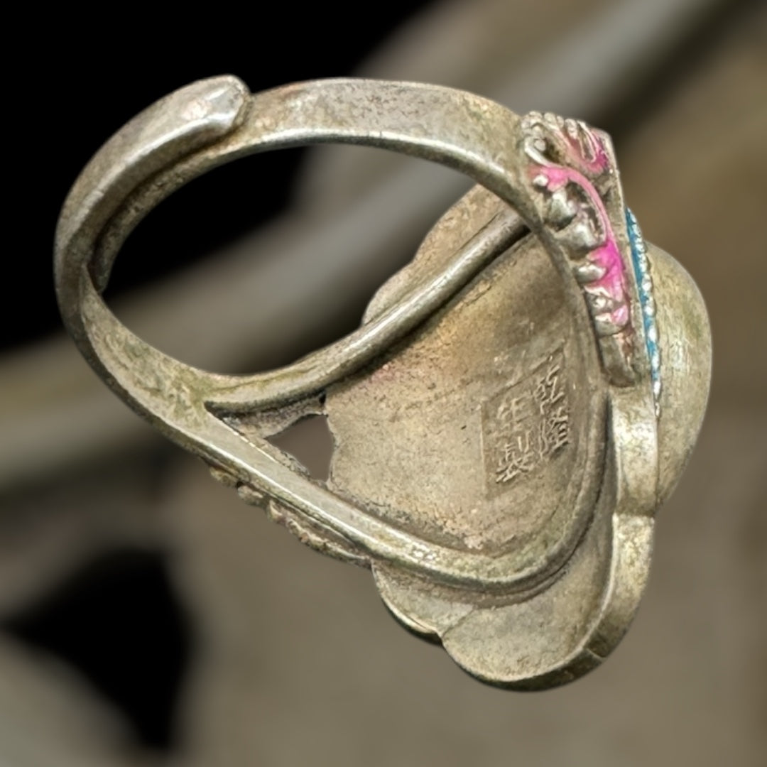 This is a unique Chinese Tibetan eye agate and enamel Ring with blue box! Adjustable