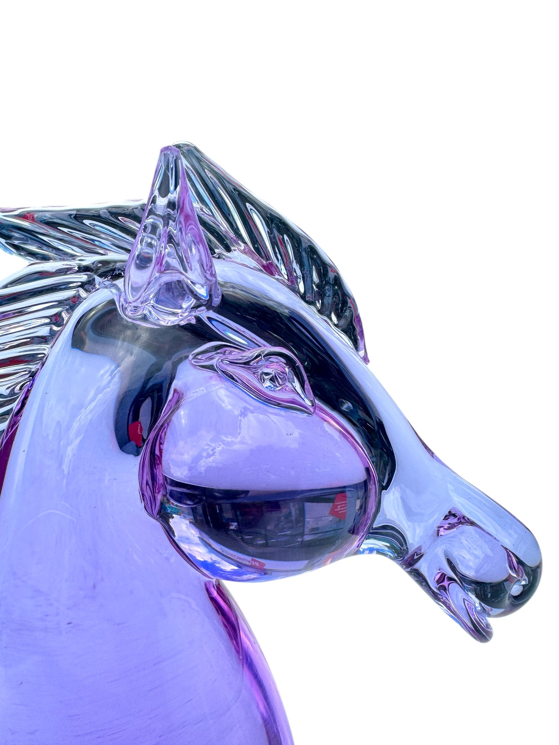 A breathtaking piece of authentic Murano artistry — this neodymium glass horse head sculpture, signed by Licio Zanetti, is a striking collector’s item showcasing the finest Italian glass craftsmanship.