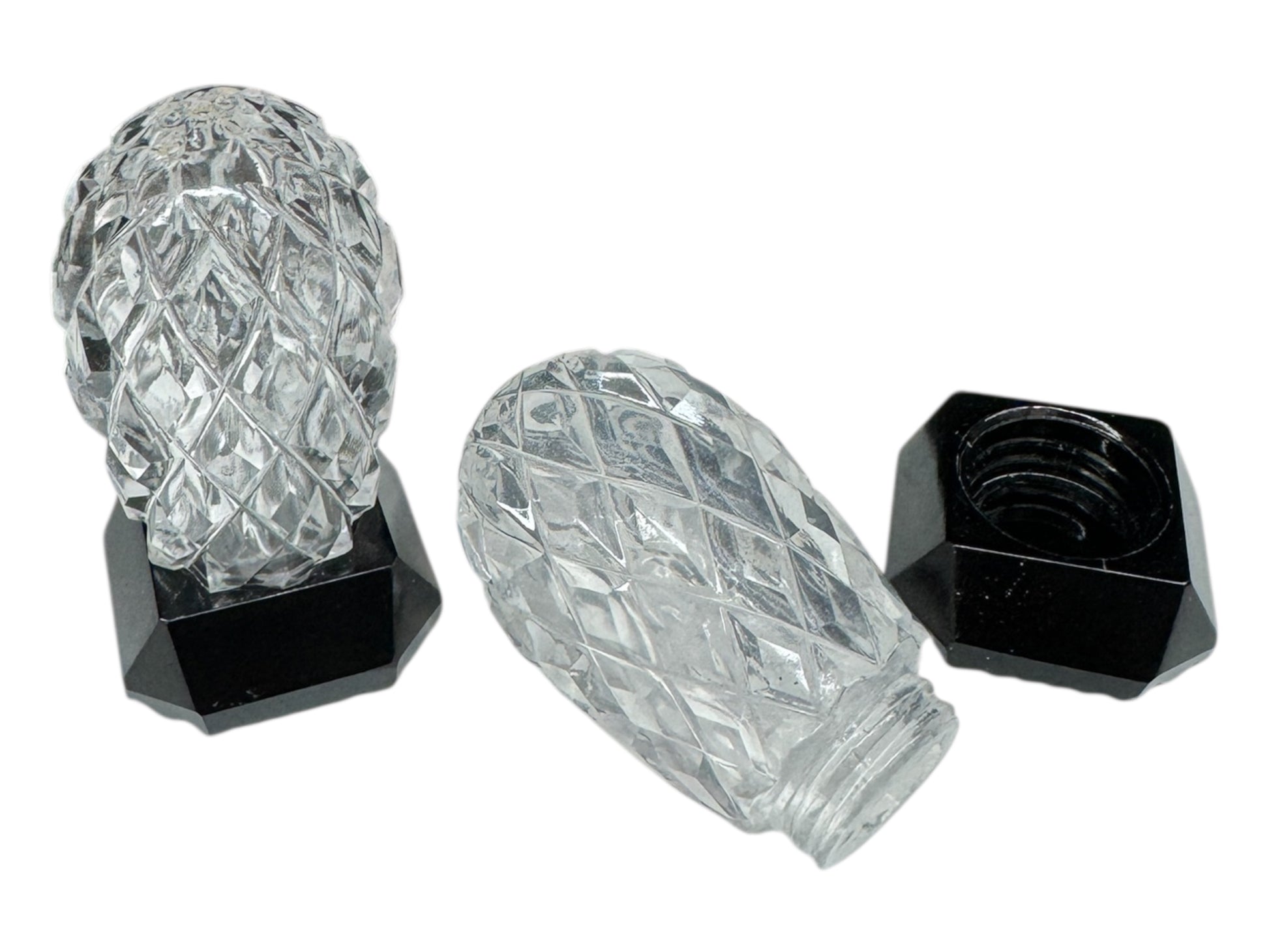 Vintage Art Deco Cut-Glass Salt & Pepper Shakers with Black Bakelite Caps
