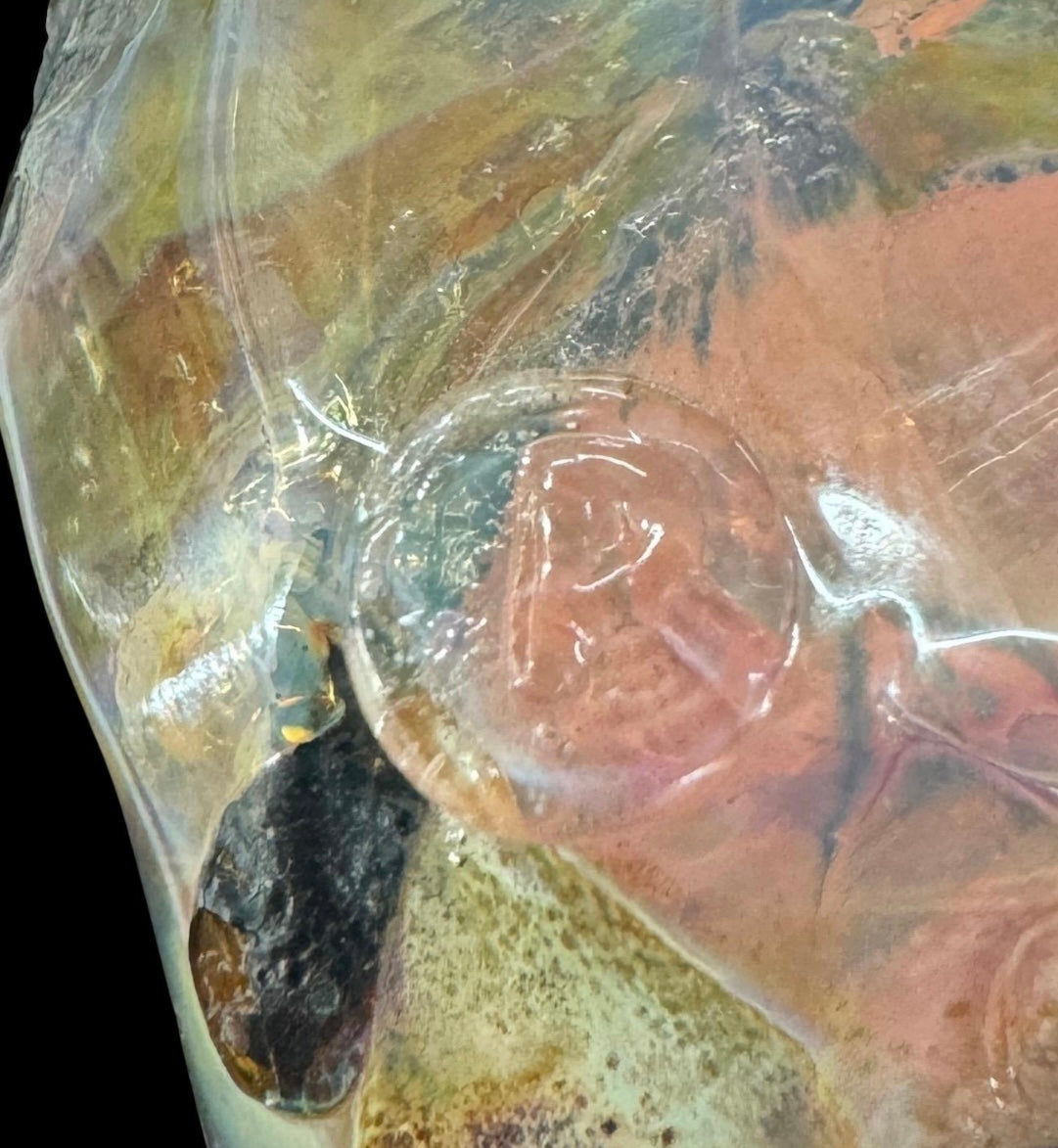 This one-of-a-kind piece features beautiful iridescent colours that shift beautifully under light — with swirls of amber, violet, green and gold encapsulating delicate internal bubbles and organic textures.