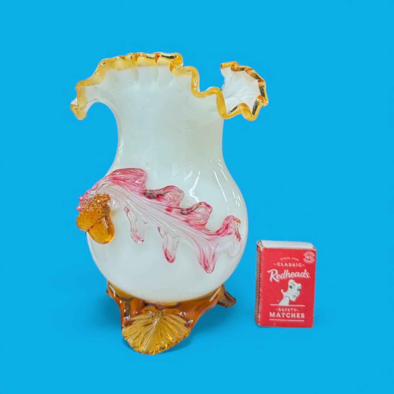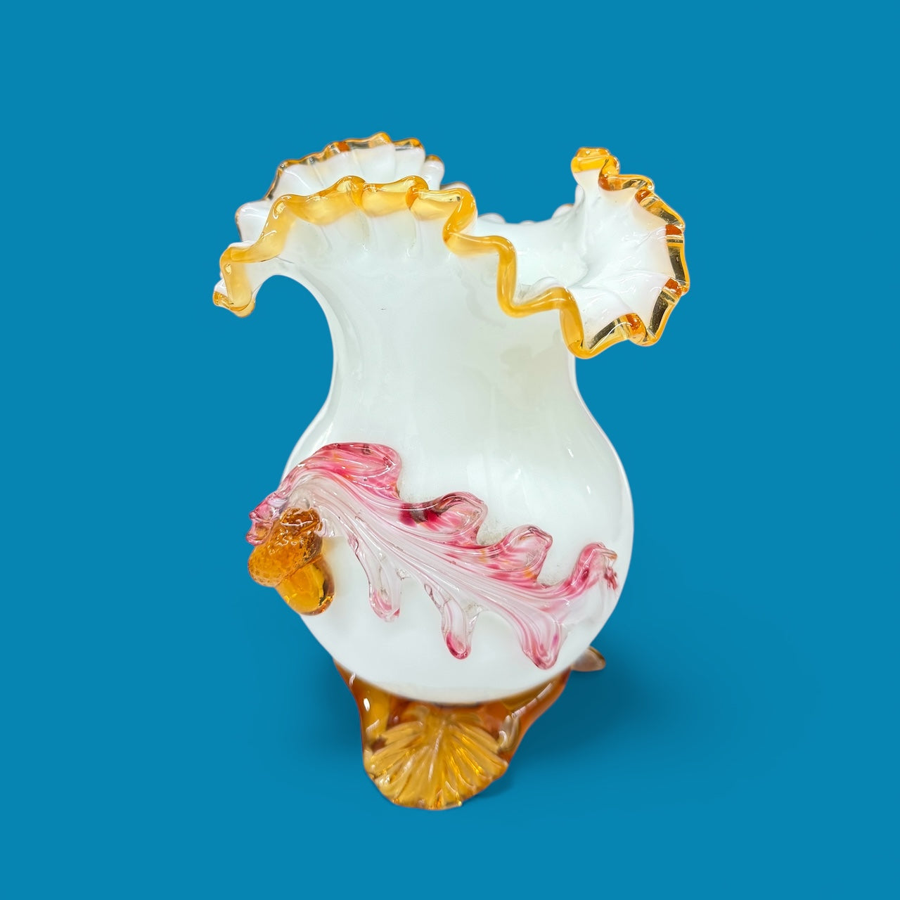 Victorian Art Glass(uranium glass) vase by Stevens and Williams.(1850-1899). The colors are White Opal that is lined with Pink glass. They have applied Amber glass leaves and branches and flowers. The ruffled crimped tops also have applied Amber edges. The bases have Applied Amber feet.