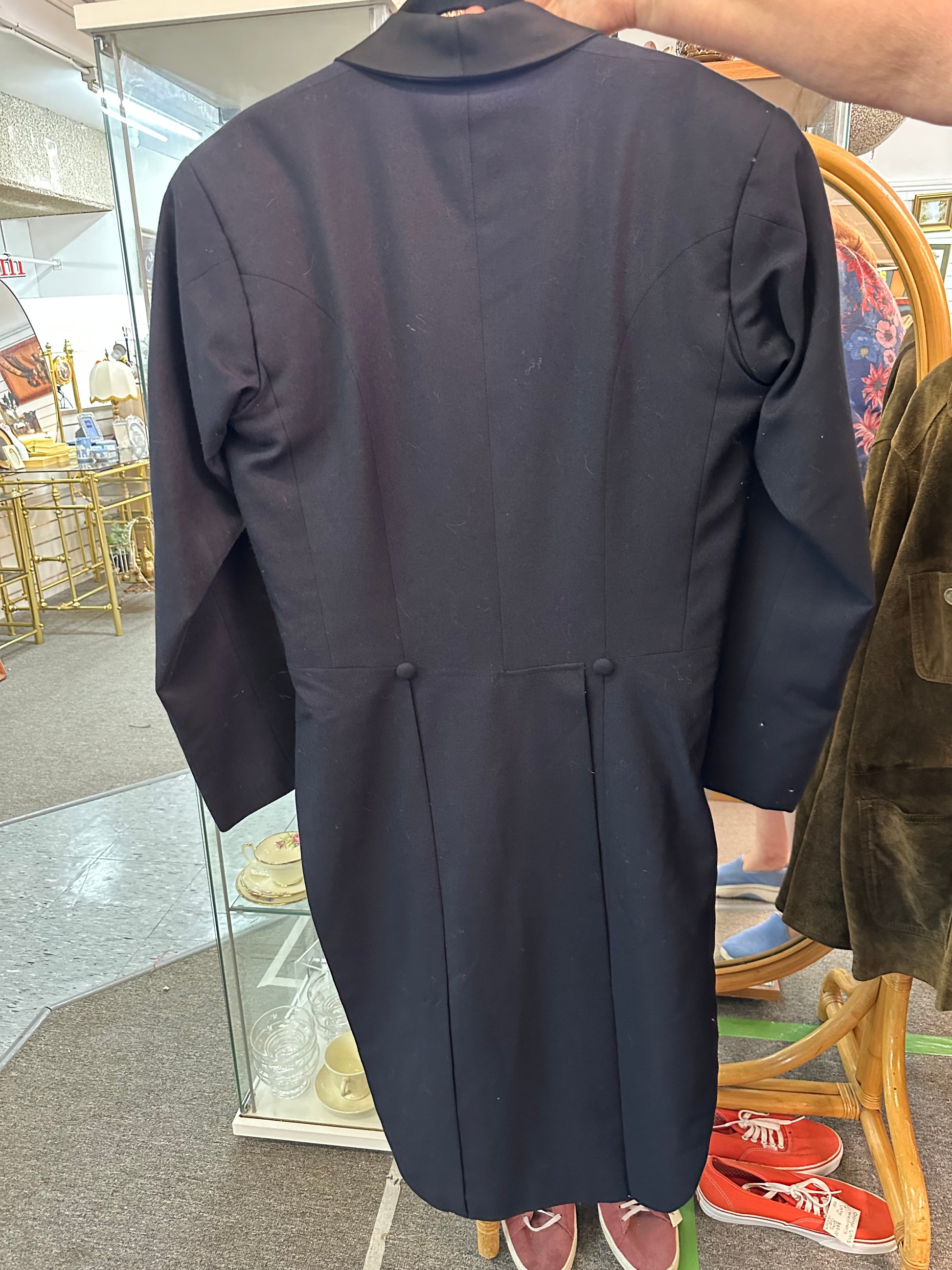The coat includes interior fastening tabs and covered buttons on both the front and back panels, typical of classic tailcoat construction.