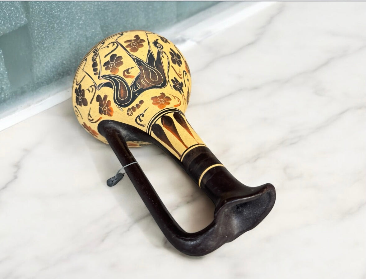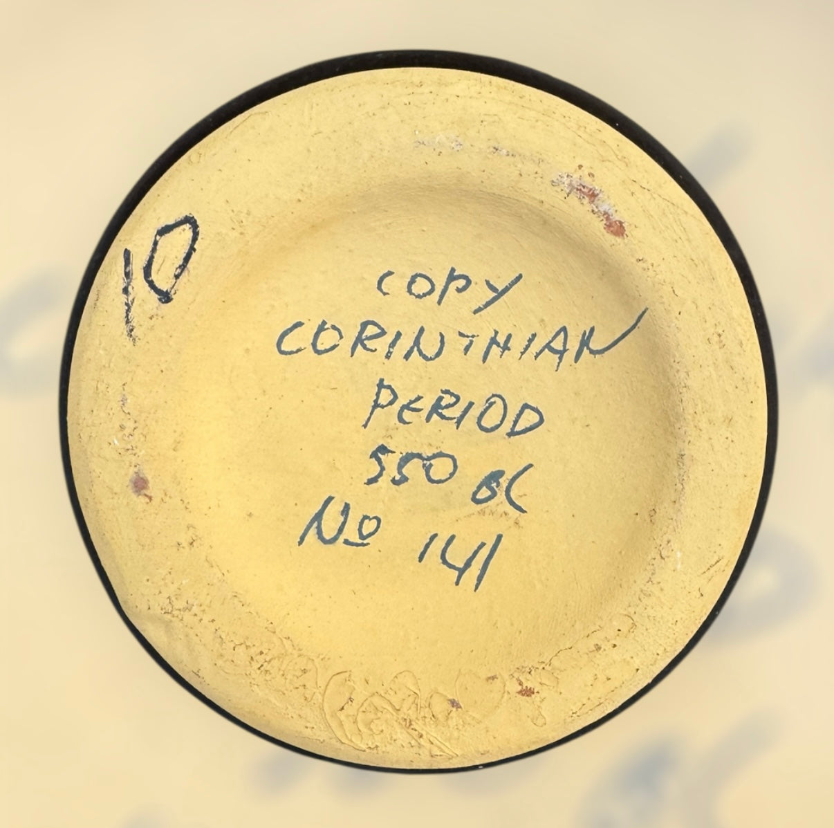 Decorative Greek Corinthian-style terracotta jug. Hand-painted with classical motifs and handle. Marked on the base as a copy of a Corinthian period piece (550 BC).